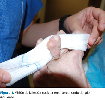 En la exploración se observa luxación metatarsofalángica en 2-3-4 dedos del pie izquierdo y en el margen dorsolateral del tercer dedo del pie izquierdo se apreció un nódulo subcutáneo, esférico, bien delimitado y definido, de consistencia dura y superficie queratósica, que provocaba conflicto interdigital con el calzado y dolor intenso a la deambulación (Figura 1).
