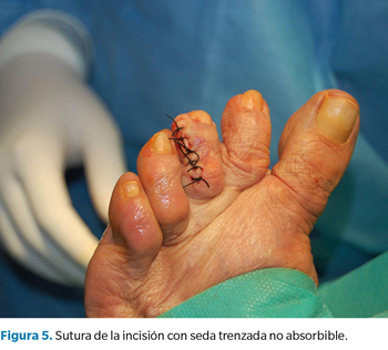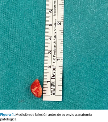 Tras acomodar a la paciente en decúbito supino, se procedió a la limpieza y aseptización del pie izquierdo; se realizó un bloqueo anestésico en la base del tercer dedo con mepivacaína al 2 % (Figura 2) y una hemostasia supramaleolar mediante manguito neumático. Se realizó una incisión elíptica dorso-medial sobre la interfalángica distal, y una disección meticulosa con la ayuda de unas pinzas y bisturí del número 15, para permitir la exposición de la lesión nodular y su exéresis en bloque (Figura 3). Una vez retirado el nódulo de color blanquecino y consistencia elástica, se midió (1 x 0.5 cm) y se reservó para su posterior envío a anatomía patológica (Figura 4). Para finalizar, se presentaron los márgenes de la incisión para valorar la viabilidad del cierre y se procedió a la sutura de la piel con seda trenzada no absorbible 3/0 (Figura 5) y un vendaje semicompresivo.