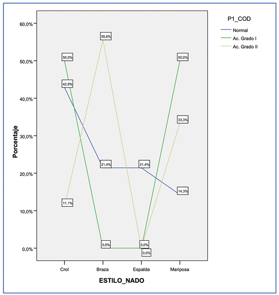 En la Figura 1, se observa cómo existe acortamiento de la extensibilidad de la musculatura isquiosural en los distintos estilos de nado, a excepci�n de los nadadores especializados en el estilo de espalda, de los que el 100 % presentan valores dentro de la normalidad. En el estilo de nado de braza, alrededor del 56 % de los sujetos presenta un acortamiento de grado II, mientras que en el estilo de nado de crol y mariposa predomina el acortamiento de grado I con un 50 % de los sujetos en ambos estilos.