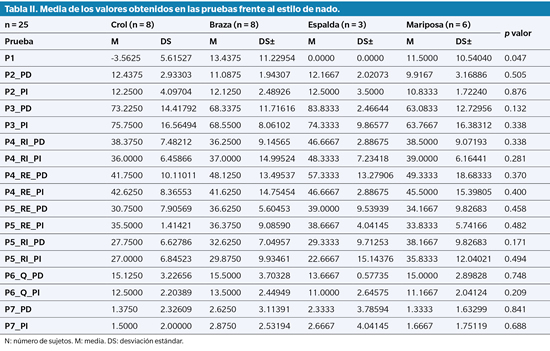 Del mismo modo, el comportamiento del miembro inferior en la nataci�n se comporta igual, en todos los estilos de nado, a excepci�n de la prueba uno, “Toe Touch” (P1), donde s� se aprecia una ligera diferencia significativa (p valor, es 0.047, Prueba Kruskal-Wallis) (Tabla II).