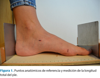 Las mediciones de la altura del ALI normalizadas se realizaron en todos los sujetos con la misma metodología, definida para el estudio siguiendo protocolos previos de Williams y cols.4, McPoil y cols.18 y Evans y cols.19. En primer lugar, siguiendo la metodología descrita por Mall y cols.20, se marcaban los puntos anatómicos de referencia en el tubérculo de escafoides y extremo distal medial de la cabeza de primer metatarsiano (Figura 1). Posteriormente, con un medidor de longitud del pie y dos reglas (escuadra y cartabón), de las cuales una se consideraba punto de referencia estable en plano transverso para ofrecer mayor precisión y estabilidad a la medición en plano sagital, se obtuvieron las siguientes mediciones: a) longitud total del pie: longitud desde la parte posterior de talón a la zona más distal del dedo más largo; b) longitud truncada: longitud desde la parte posterior de talón a la zona más distal de la cabeza de primer metatarsiano; c) altura de tubérculo de escafoides: altura desde la superficie de apoyo a la zona más inferior del tubérculo de escafoides; d) altura del dorso al 50 % de la longitud total: altura del dorso del pie en el punto que longitudinalmente coincide con el 50 % de la longitud total (Figura 2).