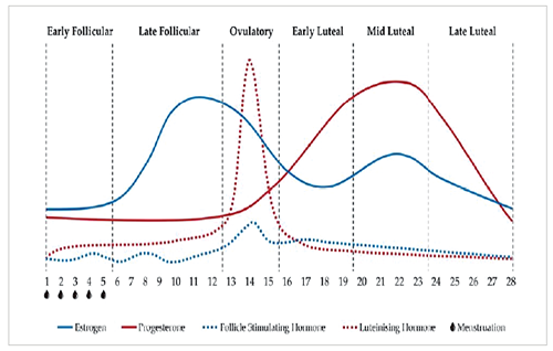 El ciclo menstrual es un indicador sensible de la salud femenina que comienza en la pubertad con la menarquia. Los ciclos menstruales normales varían entre 21 y 35 días, la literatura científica6,7 divide al ciclo en distintas etapas: fase 1 (día 1 al 7), fase 2 (días 8 al 14), fase 3 (día 15 al 21), fase 4 (22 al 28) y fase 5 perimenstrual (día 25 al día 3 del nuevo ciclo menstrual).