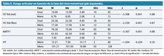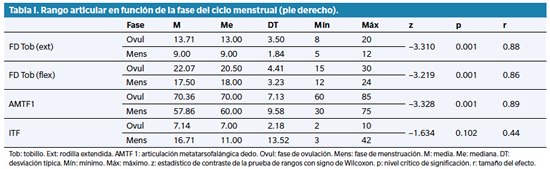 Resultados: Tras el análisis estadístico se observó que la flexión dorsal del tobillo, con rodilla extendida y flexionada, y la extensión de la primera metatarsofalángica del primer dedo aumentaron significativamente (p < 0.001 en ambos pies) su rango articular durante la fase de ovulación.
