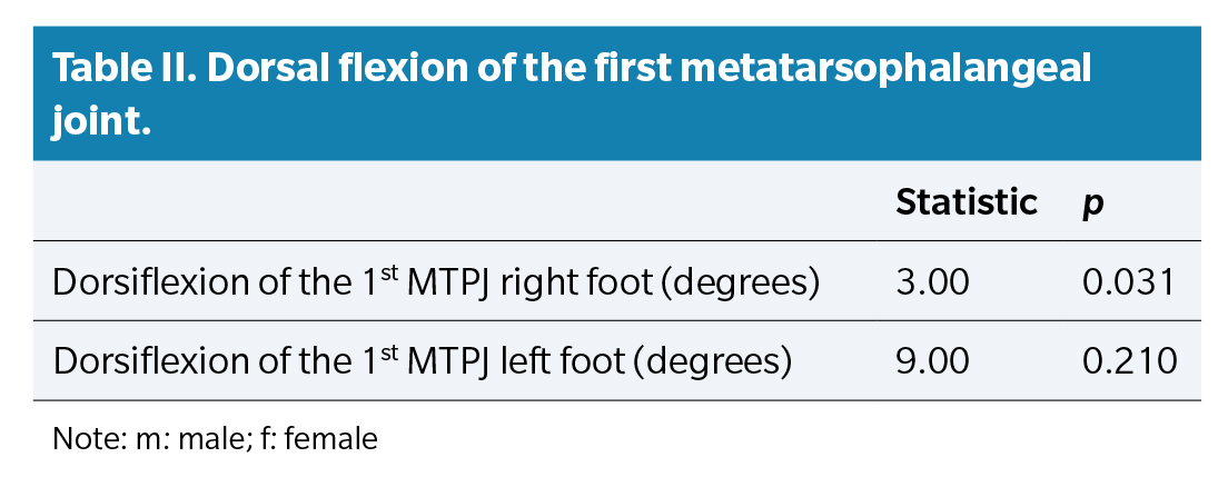 Otter et al. (17) evaluated the functional status of the 1st MTPJ in rugby players. They conducted a study with a convenience sample of 15 men and 17 women, obtaining a mean of 82.8°, also measured using a universal goniometer. Our research disagrees with the mentioned article, as our mean values of dorsal flexion presented lower joint ranges in both men and women. However, unlike the population of this study, ours consisted of athletes.