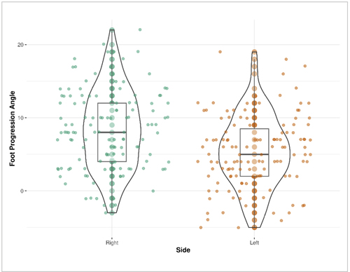 The difference between the right and left foot progression angle was 3° (95 % confidence interval: 2.20-3.90, p < 0.001) (Figure 3).