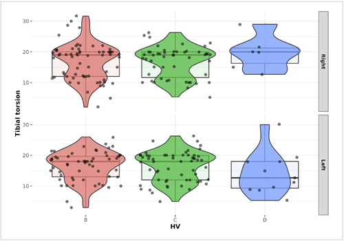 Until now, rotational and torsional asymmetries in the LE and their possible impact on the development of HV had not been analyzed. The results of this study reveal the possible existence of a left internal rotational pattern in LLE and a right external rotational pattern in RLE, as observed in previous studies such as Ries (13) and Lafuente et al. (29).