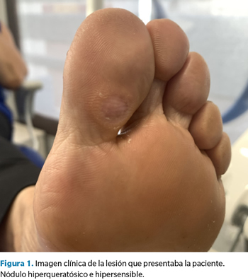 Presentamos el caso de una mujer de 58 años que consulta por la presencia de dolor constante en la región interfalángica plantar del hallux del pie izquierdo. No hay antecedentes de interés con relevancia clínica (no presenta ninguna enfermedad sistémica, alergia medicamentosa y tampoco refiere traumatismo alguno en la zona ni en ninguna otra parte del pie) y la evolución del cuadro clínico es mayor a dos años con escaso alivio mediante medidas conservadoras consistentes en la eliminación periódica de la hiperqueratosis formada en la zona (Figura 1).