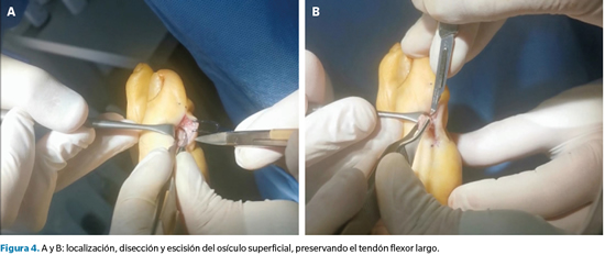 En este caso, el examen ecográfico reveló información adicional muy trascendente de cara a la planificación quirúrgica y modificando el diagnóstico previo al observarse, además del osículo articular previamente identificado, una estructura ósea superficial al tendón flexor que muy probablemente era responsable de la sintomatología que presentaba la paciente. En base a este hallazgo, decidimos realizar una exéresis quirúrgica de esta estructura, pero respetando el osículo articular y preservando en todo momento el tendón (Figura 3).