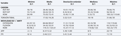 Resultados: Nuestros resultados mostraron que existían diferencias en la rotación externa entre ambas caderas de 2.34° (p < 0.001) y entre la rotación interna y externa de la cadera izquierda de 4.11° (p < 0.002). También se encontró una diferencia del ángulo de progresión del pie de 3° (p < 0.001), pero no hubo diferencias significativas entre la torsión tibial y el índice postural del pie (p > 0.05). Se encontró una diferencia en el rango de movimiento entre ambas primeras articulaciones metatarsofalángicas de 6.30° (p < 0.001), y se halló una relación entre la extensión y el rango de movimiento de la primera articulación metatarsofalángica y el hallux abductus valgus (p < 0.05).