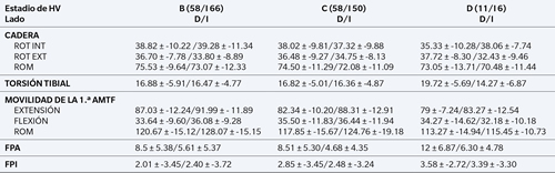 D: derecho. I: izquierdo. HV: hallux valgus. 1.ª AMTF: primera articulación metatarsofalángica. APP: ángulo de progresión del pie. FPI: foot posture índex (índice postura del pie). ROT INT: rotación interna. ROT EXT: rotación externa. ROM: rango de movimiento.