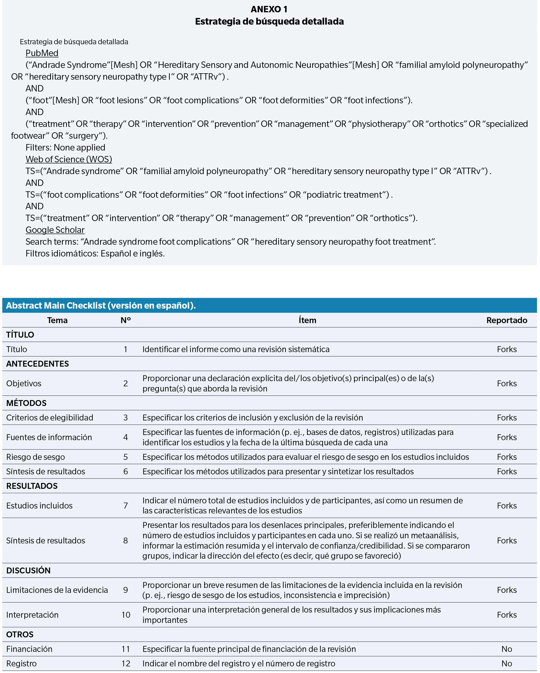 Se utilizaron las siguientes palabras clave: “Andrade syndrome”, “Hereditary sensory neuropathy type I”, “foot lesions”, “foot complications”, “foot deformities”, “foot infections”, “treatment”, “therapy”, “management”, “intervention”, “prevention”, “specialized footwear”, “physiotherapy”, “surgery”, “orthotics”, “medications”.